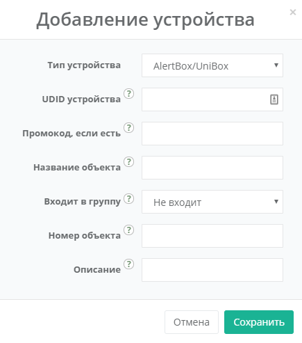 Входит в группу – можно выбрать группу, в которую Вы хотите добавить устройство (должен быть доступ к группе 90 и более). Поле отображается, если добавлена хотя бы одна группа.