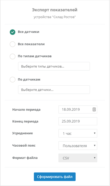 Далее выберите показатели, которые хотите экспортировать, укажите временной интервал и другие настройки, после нажмите Сформировать файл.