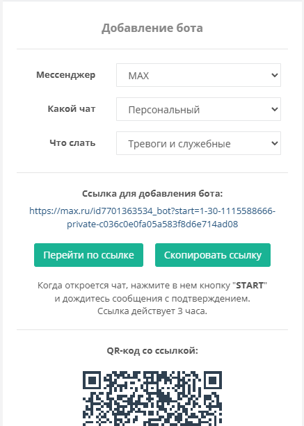 ВАЖНО! Ссылка и QR-код для подключения действительны 3 часа с момента формирования