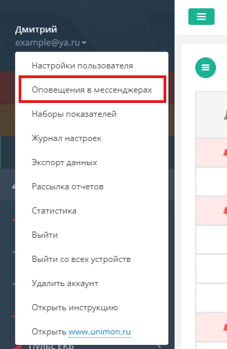 Шаг 1: В выпадающем меню пользователя выбрать раздел "Оповещения в мессенджерах"